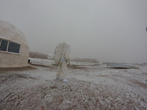 Le second sol de la mission a été celui de notre première EVA. Le matin, Arno, David et Ilaria sont sortis équipés de combinaisons de simulation, pour vérifier toutes les installations et faire le plein des rovers. De mon côté, je suis resté dans le Hab, avec John, pour cuisiner le déjeuner et préparer les nombreuses expériences que nous avons à faire. Au cours de cette première sortie que je n’ai pue photographier, la ventilation du scaphandre d’Arno a connu des défaillances. Sans danger pour lui mais il s’est du coup retrouvé avec beaucoup de buée sous son casque. Nous avons donc passé une partie de l’après-midi à démonter et nettoyer l’intérieur de son backpack pour tout remettre en place. Le reste de la journée a été assez commun, avec des réunions, des études de sciences humaines et des exercices de méditation et de team-building. Après une accalmie, la météo est repartie vers le bas. Il faut dire que nous sommes à la veille de l’hiver. On annonce ainsi du vent pour demain voire des chutes de neige (et oui, il peut apparemment neiger sur Mars…). Mais pas de quoi entamer notre détermination et notre optimisme !