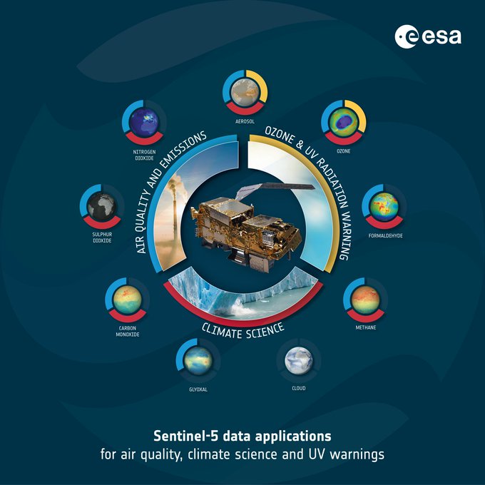 En détectant les ondes lumineuses à travers sept bandes spectrales, l’instrument peut différencier 1 000 fois plus de couleurs que l’œil humain. Cela permet à Sentinel-5 de détecter la pollution et les substances nocives dans l’atmosphère que nous ne pouvons pas voir, sur toute la surface du globe. La mission fournit des données sur la composition de l’atmosphère terrestre, et comment elle évolue sur au quotidien. Le spectromètre observe l’ozone, le dioxyde d’azote et le dioxyde de soufre, le formaldéhyde, le monoxyde de carbone et le méthane, ainsi que les aérosols et mesure l’indice UV. La mission fournira également des données sur la répartition verticale de plusieurs de ses composants, offrant une vue tridimensionnelle. Il peut indiquer quand nous sommes le plus exposés au risque de coup de soleil dû aux rayonnements ultraviolets et peut détecter les émissions de gaz à effet de serre telles que le méthane.