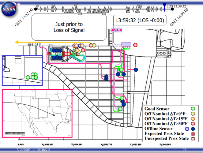 Juste avant 9 heures du matin heure locale (ou 14h UTC), des télémétries anormales sont apparues sur les écrans du centre de contrôle de la mission du Johnson Space Center de la NASA à Houston. Les relevés de température des capteurs situés sur l’aile gauche de la Navette sont perdus. Ensuite, les relevés de pression des pneus du côté gauche de la navette ont également disparu.