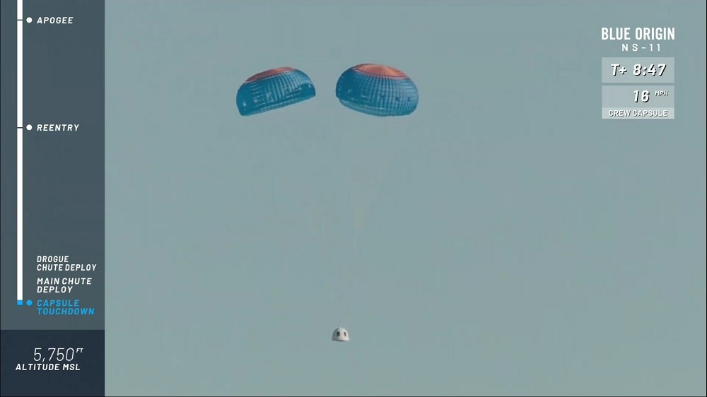 Moins de trois minutes plus tard, la capsule a atterri à l’aide de trois parachutes et rétro-fusées pour compléter le 11e vol suborbital de Blue Origin depuis avril 2015.