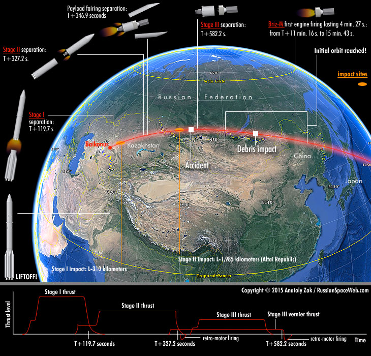 La séparation de la coiffe protégeant le satellite s’est déroulé nominalement à T+5 min 45 sec. Mais environ 8 minutes et 10 secondes après le décollage, le lanceur ayant atteint 161 km d’altitude, une anomalie, à priori du 3e étage, a entraîné la destruction dans l’atmosphère du 3e étage du lanceur et du satellite restés attachés. La séparation du dernier étage Briz-M aurait dû se produire environ 9 minutes et 13 secondes après le décollage.