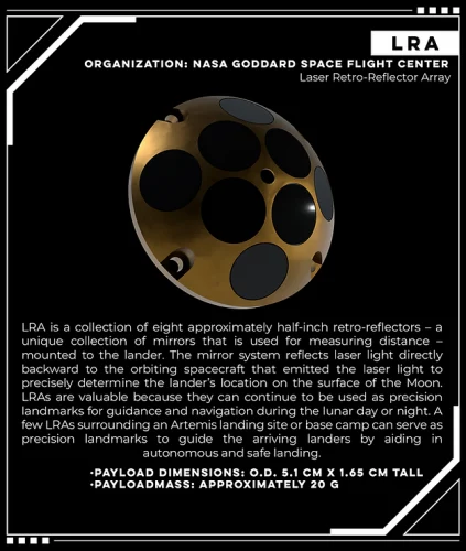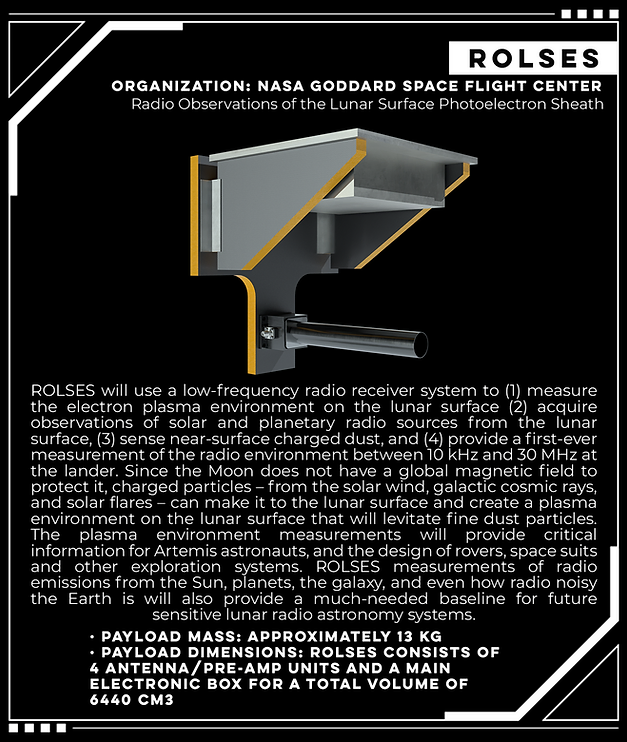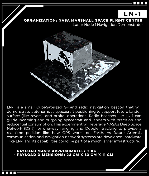 Lunar Node 1 Navigation Demonstrator (LN-1), un cubesat qui intègre la navigation et des fonctionnalités de communication pour une navigation autonome.Radio-wave Observations at the Lunar Surface of the photo Electron Sheath (ROLSES). ROLSES utilisera quatre antennes et un système de récepteur radio basse fréquence pour déterminer la densité et la hauteur d’une couche très mince d’électrons au-dessus de la surface de la Lune, détecter également les sursauts radio du Soleil, les émissions radio de Jupiter, la poussière impactant la surface de la Lune, et comment la Terre est « radio bruyante ».