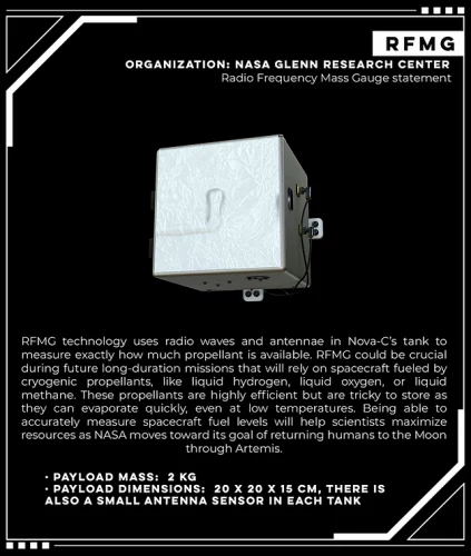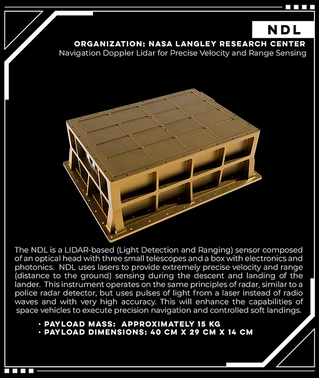 Radio Frequency Mass Gauge (RFMG), une jauge de carburant utilisée pour mesurer la quantité de propergol dans les réservoirs de l’atterrisseur dans un environnement spatial à faible gravité.Navigation Doppler Lidar for Precise Velocity and Range Sensing (NDL), un LIDAR (radar à impulsions de lumière) pour mesurer la vitesse du lander et son altitude avec une grande précision pendant la descente et l’alunissage.