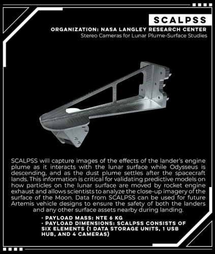 Stereo Cameras for Lunar Plume-Surface Studies (SCALPSS), 4 caméras pour capturer des données stéréo et des images du panache de poussière créé par le moteur de l’atterrisseur.Laser Retroreflector (LRA), 8 catadioptres permettant une télémétrie laser de précision, une mesure de la distance entre l’engin spatial en orbite ou à l’atterrissage vers le réflecteur sur l’atterrisseur.