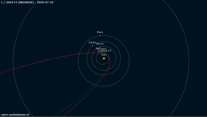 Le graphique orbital interactif ci-dessus montre le trajet de la comète Neowise à travers le Système Solaire et sa position au 10/07/2020 (crédit http://astro.vanbuitenen.nl/