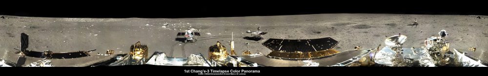 Ce panorama composite créé à partir d’un time-lapse numérique montre la région entourant l’atterrisseur Chang’e-3, avec une image du rover Yutu en 3 positions différentes. À l’extrême droite, Yutu est vu en direction du sud, probablement pour ne jamais revenir à son atterrisseur.
