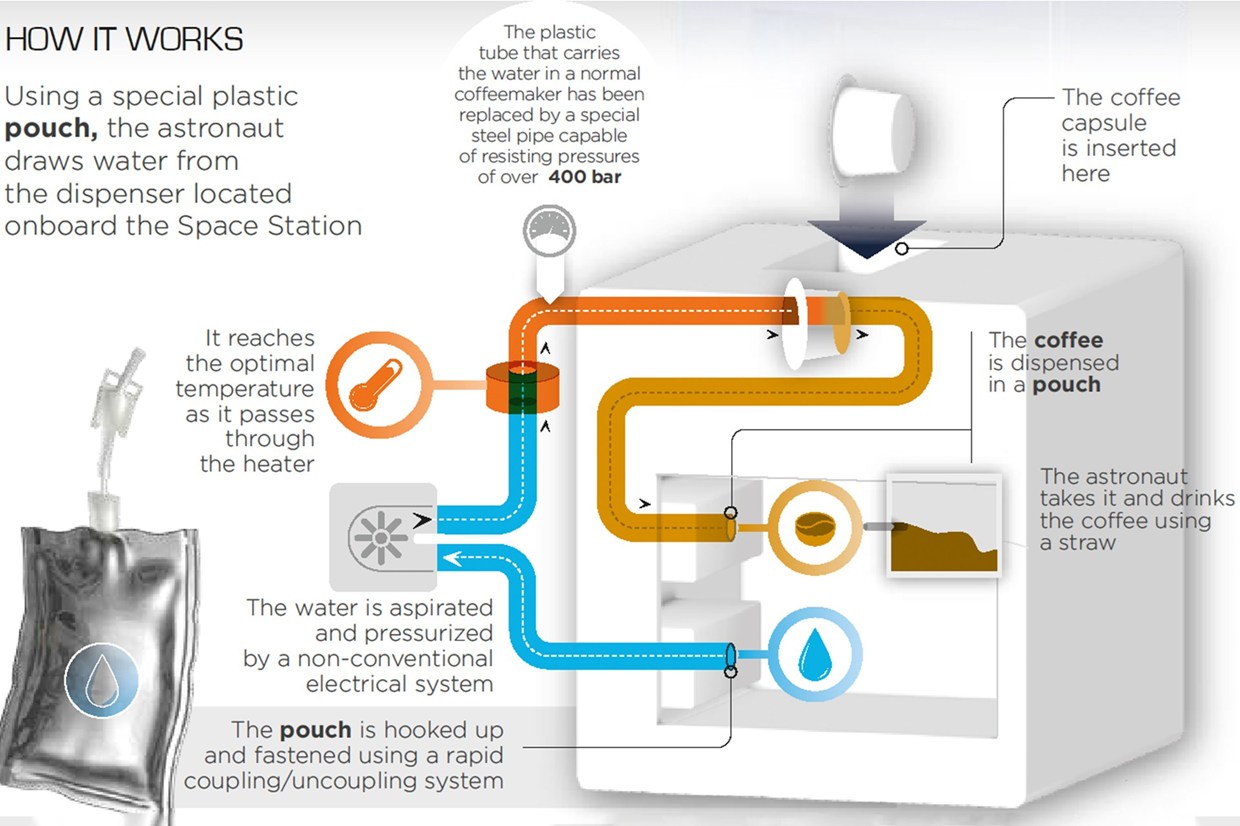 Cette première machine Expresso, qui pèse 20 kg avec tous les mécanismes de sécurité supplémentaires nécessaires dans l’ISS, a été modifiée par rapport à une machine terrestre : par exemple, le tuyau de vapeur, ce qui serait un tube en plastique dans votre machine est remplacé par un tube en acier capable de résister à 400 bars de pression (beaucoup plus élevé que les 9 bars spécifiés par l’Institut National Espresso italien pour faire un Espresso « certifié italien » !).