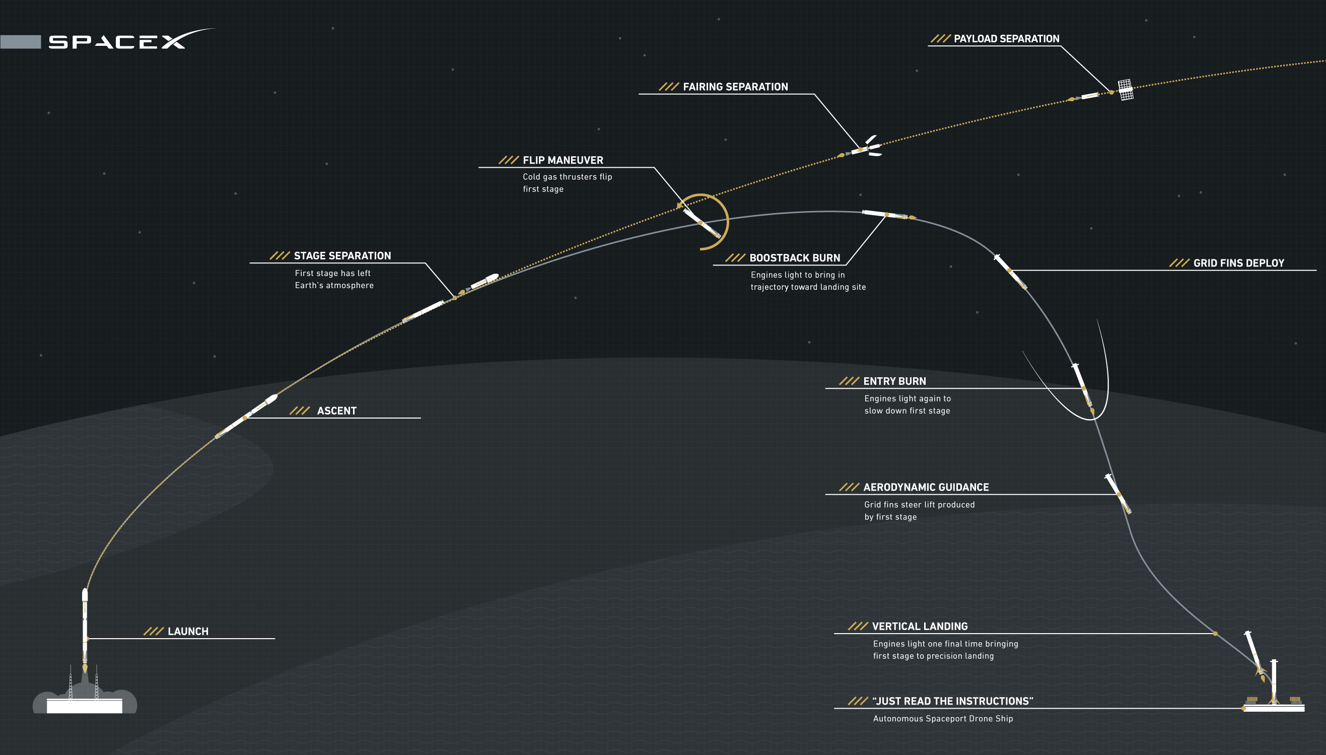 Stationné à environ 300km au nord de Cap Canaveral, la barge est équipée de propulseurs sous-marins pour maintenir sa position lors de la descente de la fusée. Après le largage de l’étage supérieur de la Falcon 9, environ trois minutes après le décollage, un sous-ensemble de ses 9 moteurs effectueront trois manœuvres pour guider l’étage vers la zone d’atterrissage dans l’océan Atlantique. Lors du test précédent, les quatre ailettes de stabilisation ouvertes pour ralentir la vitesse du lanceur pendant la descente ont manqué de fluide hydraulique, provoquant la destruction du premier étage sur la barge [lire article « l’atterrissage raté de la Falcon 9R sur la barge« ], mais ce problème devrait être réglé pour ce vol.