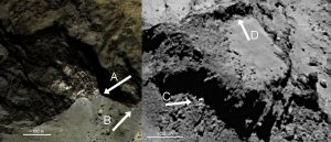 Le rôle du vent et de l’atmosphère, qui permettent l’érosion et les déplacements de matière à la surface de la Terre, serait ici joué par les gaz s’échappant de l’intérieur du noyau cométaire, notamment via des trous béants principalement situés près du cou de la comète. Ces gaz forment alors l’atmosphère cométaire, que l’on appelle coma, tout en traînant la poussière à la surface, laissant apparaître ces formes presque terrestres.