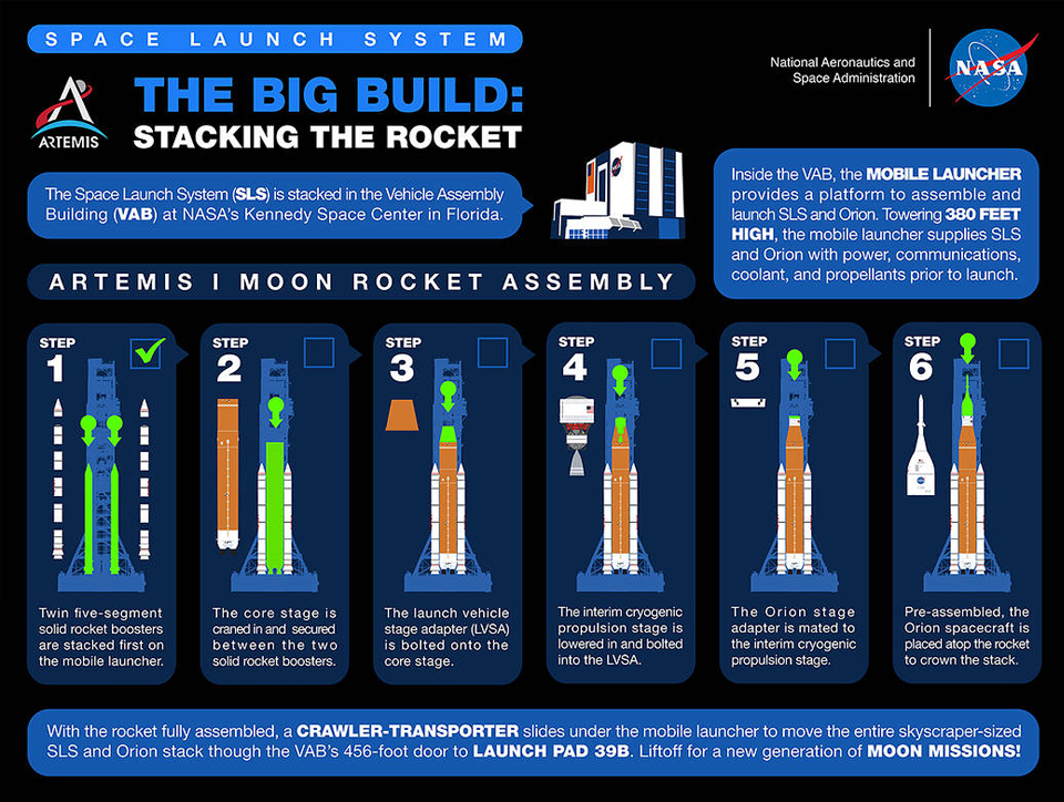 À l’intérieur de l’emblématique bâtiment d’assemblage ou VAB (Vehicle Assembly Building) qui a vu passer les Saturn V des missions Apollo et les Navettes Spatiales, les équipes de la NASA et les industriels impliqués ont empilé les différents éléments de la fusée sur sa plateforme de lancement mobile. Le bâtiment et la plateforme mobile, ou crawler, ont été spécialement aménagés pour accueillir le SLS et le vaisseau spatial Orion.