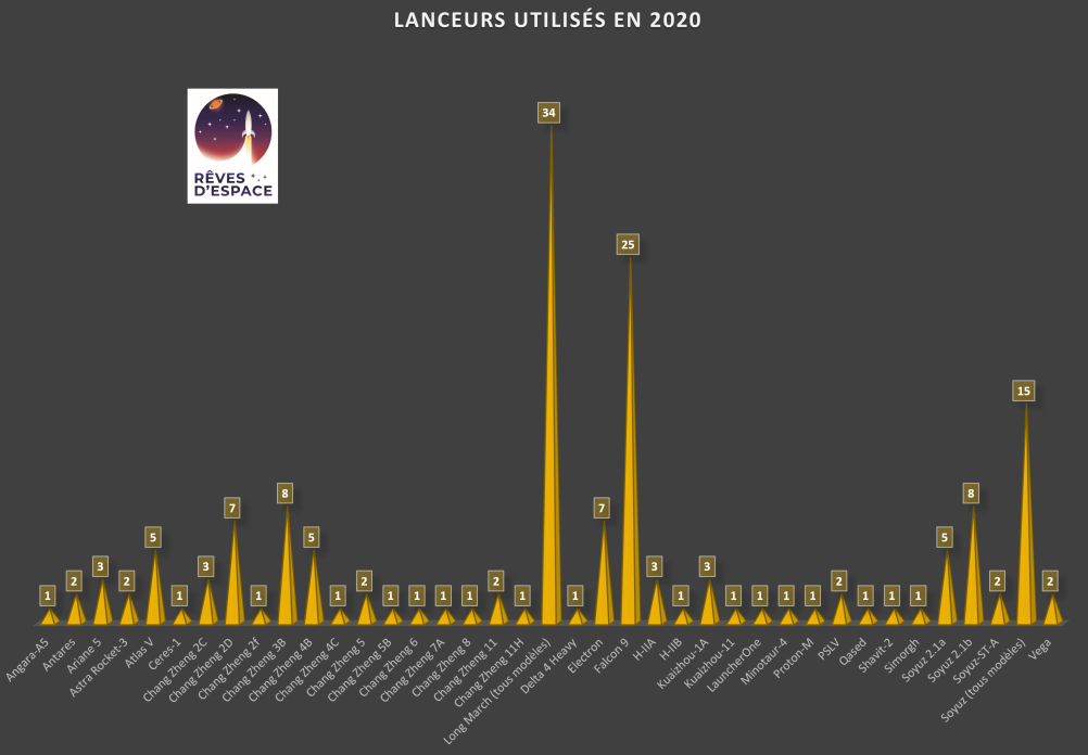 SpaceX devient incontournable avec son lanceur Falcon 9 : 18 tirs en 2017, 20 en 2018, 11 en 2019 et 25 en 2020. L’entreprise a même dépassé les 100 lancements cette année.