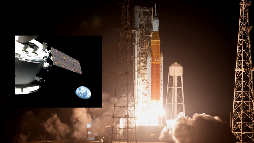 Décollage du SLS le 16/11/2022 et première image de la Terre par le vaisseau spatial inhabité Orion après séparation du lanceur (crédit NASA)