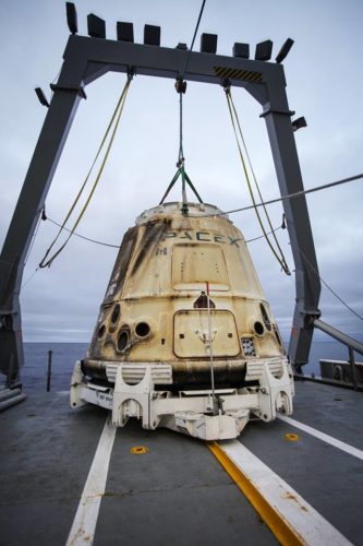 Le Dragon CRS-11 hissé sur un bateau au large de la Californie après son retour de l’espace le 03/07/2017 (crédit : SpaceX)