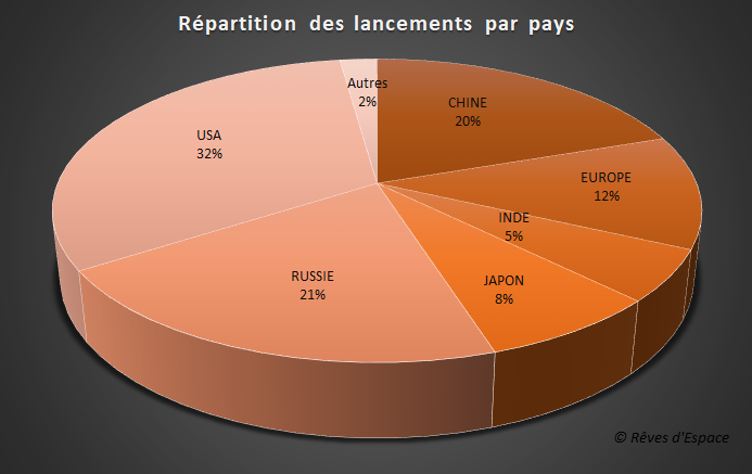 Les Etats-Unis restent à la première place avec 29 lancements dont 18 avec la seule Falcon 9, tous réussis. La Russie avec 19 lancements (dont 1 échec) reprend la 2e place à la Chine (18 lancements dont 2 échecs). L’Europe reste 4e avec 11 lancements comme en 2016, malgré les grèves en Guyane qui ont ralenti la cadence au printemps.