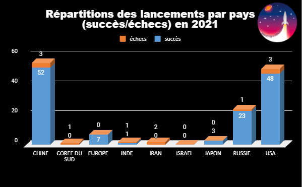 Pour les autres nations ou opérateurs : 3 vols Vega et 3 vols Ariane 5, et 1 seul vol Soyouz pour Arianespace, soit autant qu’en 2020. Le lanceur sud-coréen Nuri a raté son vol inaugural. L’Iran a au moins fait 2 tentatives de lancement mais tous défaillants. L’Inde ne fait pas mieux qu’en 2020 avec 2 lancements dont un échec. Le Japon réalise 3 lancements, soit 1 de moins qu’en 2020.
