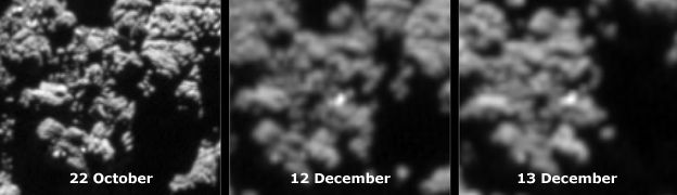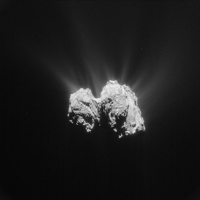 Rosetta va continuer à tourner autour de 67P jusqu’en 2016. Désormais, la sonde orbite à une distance supérieure à 100 km. La comète connait une activité de plus en plus intense au fur et à mesure qu’elle se rapproche du soleil. Les jets de gaz et de vapeur d’eau se font plus nombreux et violents, ce qui a même provoqué un incident sur le satellite en mars dernier : ses senseurs stellaires ont confondu des particules émises dans les jets avec des étoiles entraînant un mauvais positionnement de Rosetta (plus de détails dans l’article d’Enjoy Space : Rosetta trompée par de fausses étoiles).