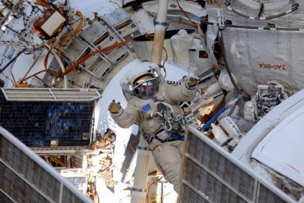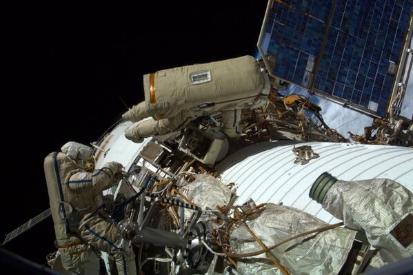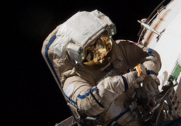L’un des 2 cosmonautes lors de l’EVA 37 de décembre 2013 (source Twitter @scolarson)