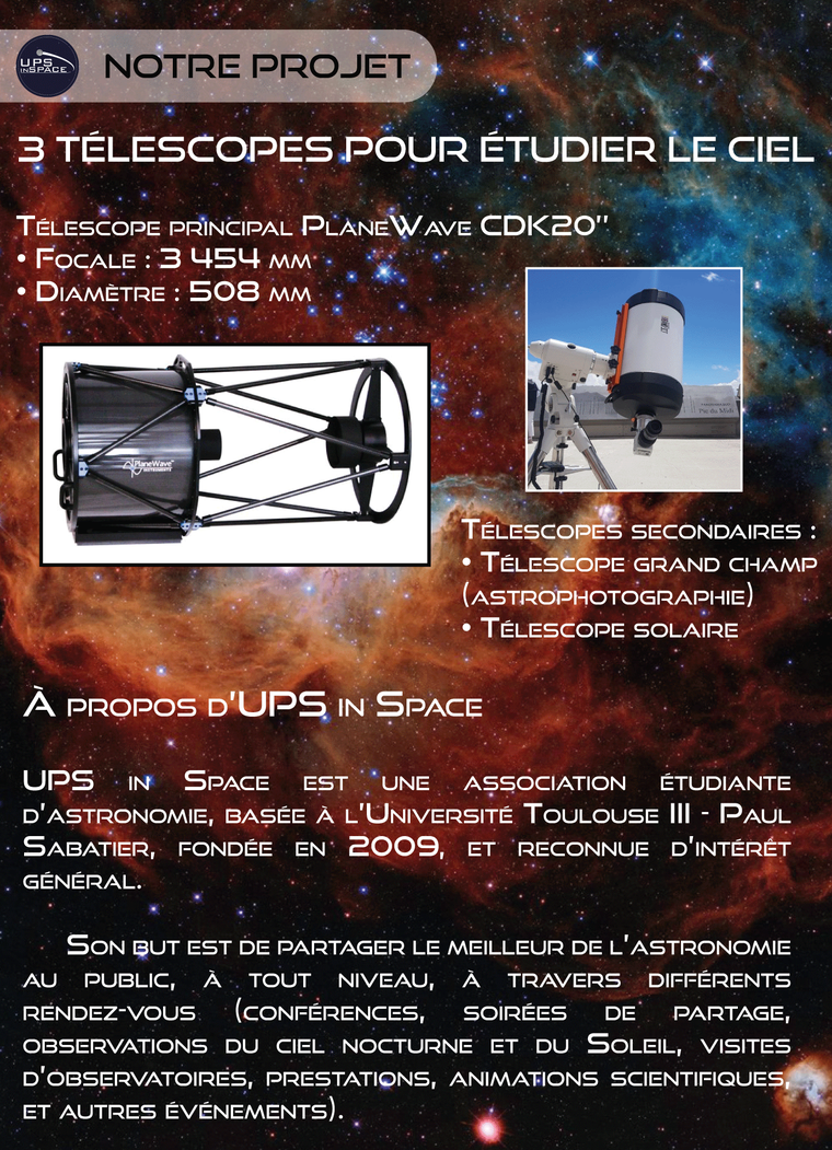 UPS in Space est une association étudiante d’astronomie, basée à l’Université Toulouse III – Paul Sabatier, fondée en 2009, et reconnue d’intérêt général. Son but est de partager le meilleur de l’astronomie au public, à tout niveau, à travers différents rendez-vous (conférences, soirées de partage, observations du ciel nocturne et du Soleil, visites d’observatoires, prestations, animations scientifiques, et autres événements).