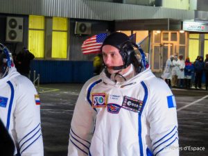 Quelques jours avant le lancement de Thomas Pesquet en nomembre 2016, devant la Soyouz sur le pas de tir historique au Cosmodrome de Baïkonour qui a vu décoller Yuri Gagarine en 1961, le premier homme dans l’espace