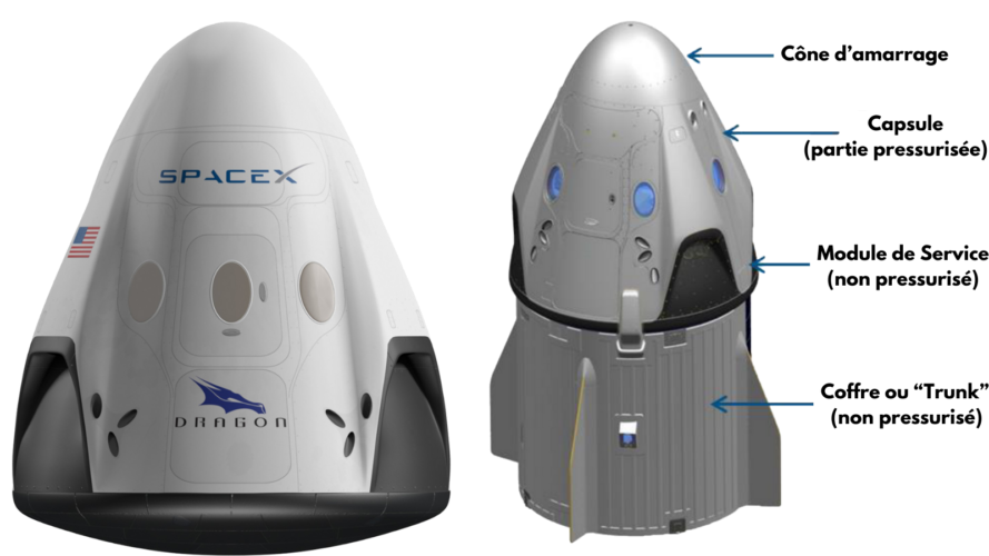 Le vaisseau spatial Dragon est composé de deux parties : une section pressurisée qui fait voler l’équipage ou la cargaison, et une section non pressurisée appelée coffre (« trunk » en anglais), qui contient notamment les systèmes pour l’alimentation électrique et le contrôle thermique du vaisseau en orbite. Lors des missions cargo, le coffre peut également livrer du matériel non pressurisé à l’ISS et en contenir au désamarrage, en fonction des besoins de la mission (par exemple, les nouveaux panneaux solaires de la Station). Lorsque Dragon revient sur Terre, le coffre est largué avant que le vaisseau n’effectue son amerrissage et il n’est pas récupéré (seule la capsule l’est et est réutilisée en général).