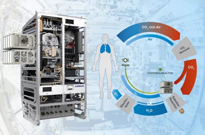 Les systèmes de support de la vie actuels dans l’espace utilisent des processus physicochimiques pour générer de l’oxygène et de l’eau et éliminer le dioxyde de carbone de la Station Spatiale. Cette nouvelle expérience vise à utiliser des processus biologiques avec la culture de micro-algues pour l’alimentation des astronautes et pour générer de l’oxygène et consommer du dioxyde de carbone. Un paramètre essentiel pour assurer la réussite des missions longue durée vers la Lune ou Mars sera de limiter au strict minimum les quantités de ressources emportées. La microalgue Chlorella vulgaris, d’ores et déjà largement utilisée dans l’alimentation et les compléments alimentaires, a été sélectionnée comme agent photosynthétique pour sa grande richesse en protéines. Ces petits organismes aquatiques dans le réacteur utilisent le principe de la photosynthèse pour la production d’oxygène, n’exigeant pour cela que de la lumière et une solution nutritive. À l’avenir, près de 30 % de la nourriture des astronautes pourraient être remplacés par cette biomasse algale [d’autres détails dans le communiqué d’Airbus]
