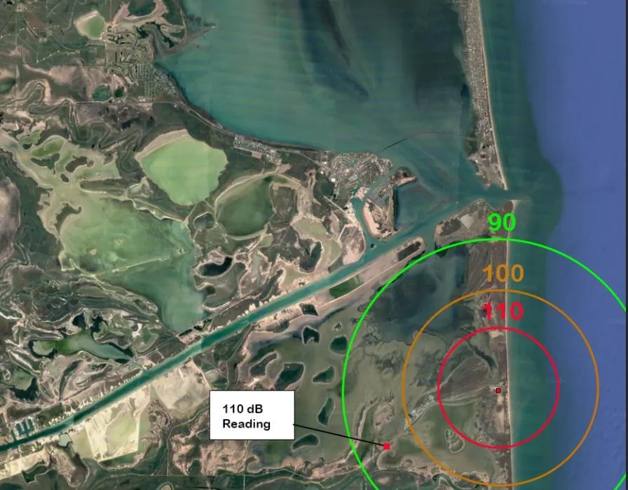 D’ailleurs la nuisance sonore lors des essais statiques a déjà été établie à 110 dB jusqu’à près de 5 km du pas de tir, bien supérieure à celle des données des modèles de SpaceX donnés à la FAA.