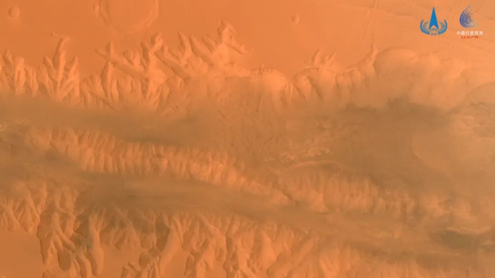 Une image de caméra à résolution moyenne d’une section de Valles Marineris, prise par Tianwen 1 le 1er avril 2022  (crédit: CNSA/PEC)