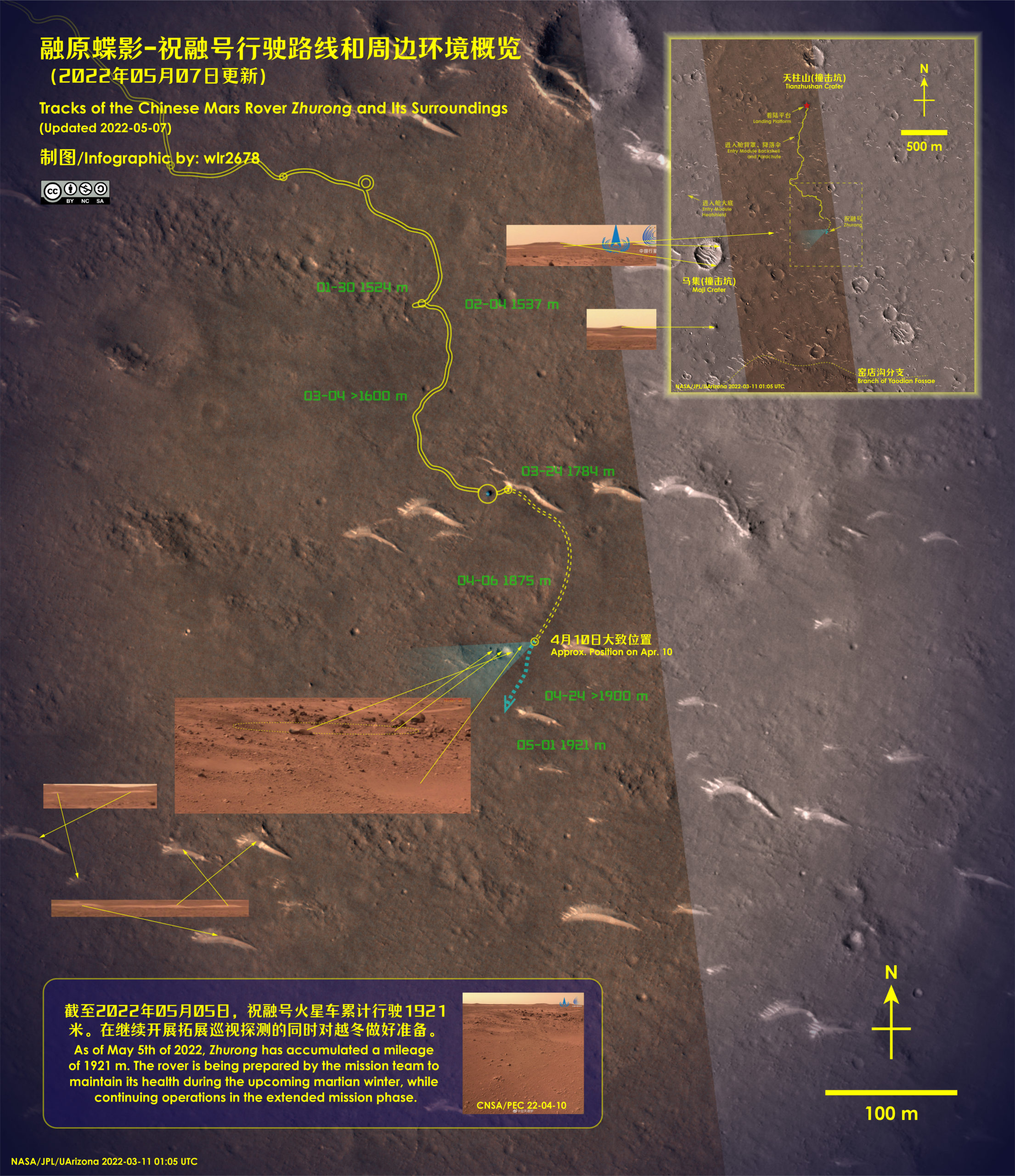 Au 6 mai 2022, le rover Zhurong a parcouru 1921 mètres.