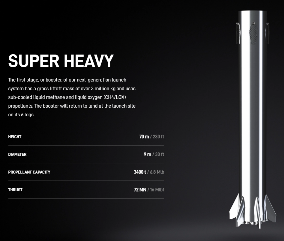La Super Heavy, c’est 70 mètres de haut et une masse de 4 400 tonnes. Equipée de 20 à 31 moteurs Raptor, la poussé délivrée serait de 5 400 tonnes. Ses réservoirs peuvent contenir 3 400 tonnes de carburant. Quatre « grid fins » (ailettes en treillis), en haut, permettent le contrôle aérodynamique lors du retour vers le sol pour un atterrissage contrôlé à la manière des Falcon 9 actuelles. Six jambes d’atterrissage enrobées et déjà dépliées complètent le lanceur.