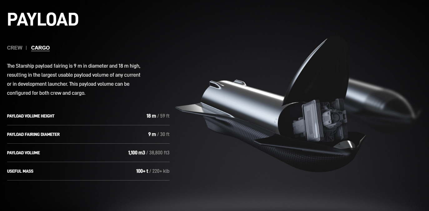 Le Starship final devrait embarquer 7 Raptor au total. Il aurait une capacité d’emport de 100 tonnes. SpaceX le propose dans une version « équipage » et une version « cargo » ou lanceur de satellite, voire d’un télescope plus grand que le James Webb Telescope…